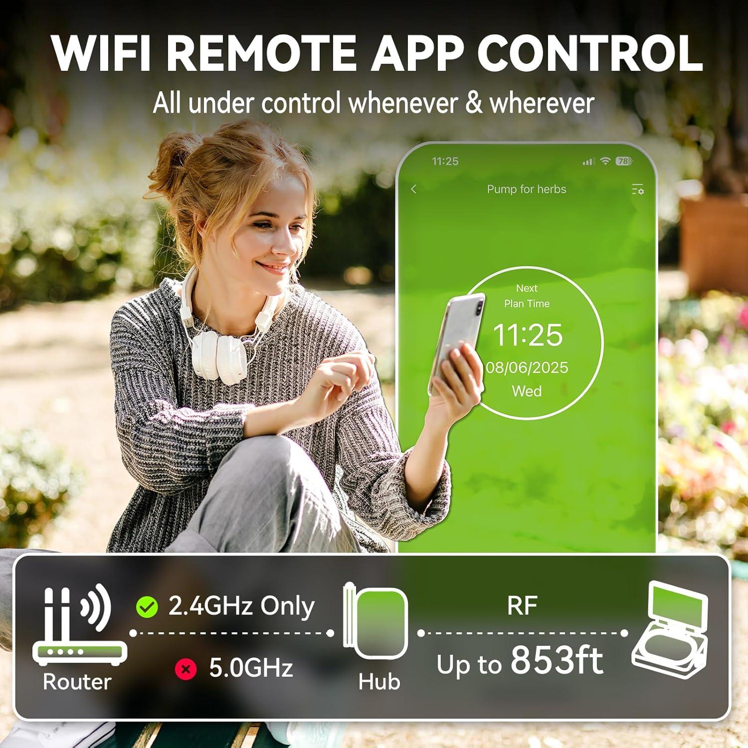 【Convertible Into Smart Version】You could either enjoy easy setup on the device itself, or pair it with our Wi-Fi hub (2.4 GHz only, model: HWG023/HWG023WBRF/HWG040—sold separately*)for remote control, integration of smart soil meter, and enjoy many other intelligent features via our powerful RainPoint Home App in your smartphone.