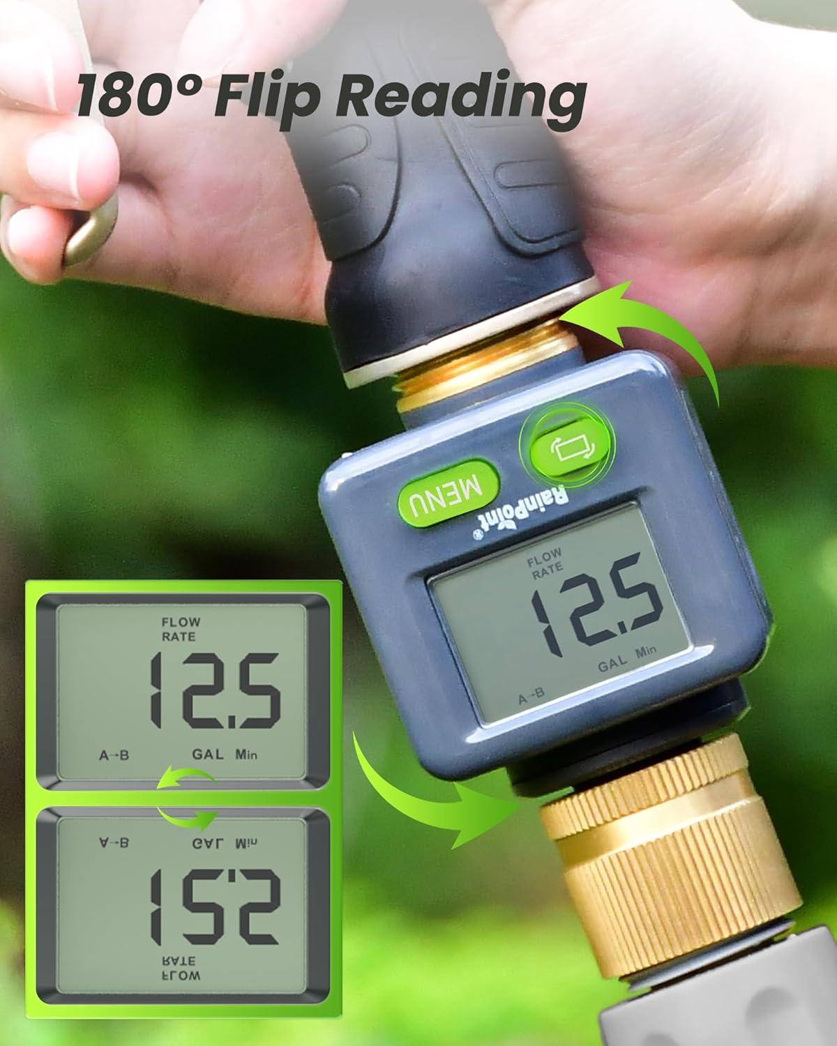 180°FLIP SCREEN: Water flow meter has one button to flip the screen, easy to read LCD screen, with quick connector to match all water garden hose, faucets, sprinklers.